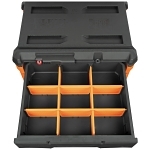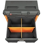 Klein Tools MODbox™ Rolling Drawer Box features accessible drawers so you can stay stacked. It features a large-capacity lower drawer and compact top drawer. Locking bar secures the drawers in transport. Drawers have removable dividers and heavy-duty ball-bearing slides for smooth operation. With 10-Inch solid rubber wheels, a removable handle, this durable rolling drawer box supports up to 250 pounds (113.4 kg). Easily connects with MODbox™ components for a custom mobile workstation.