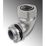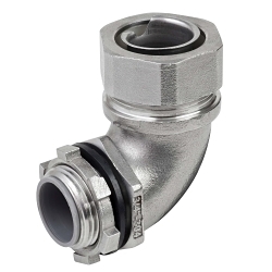 Flex connectors are used to connect stainless flexible conduit to other fittings at 90°. Assists in preventing contamination of oils, dirt, dust, and liquid when used with Calbrite PVC coated stainless flexible conduit.